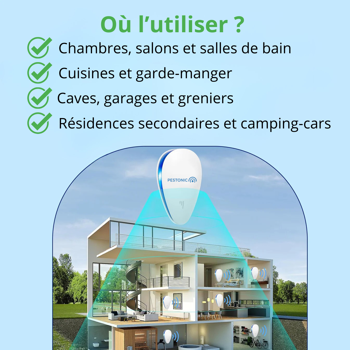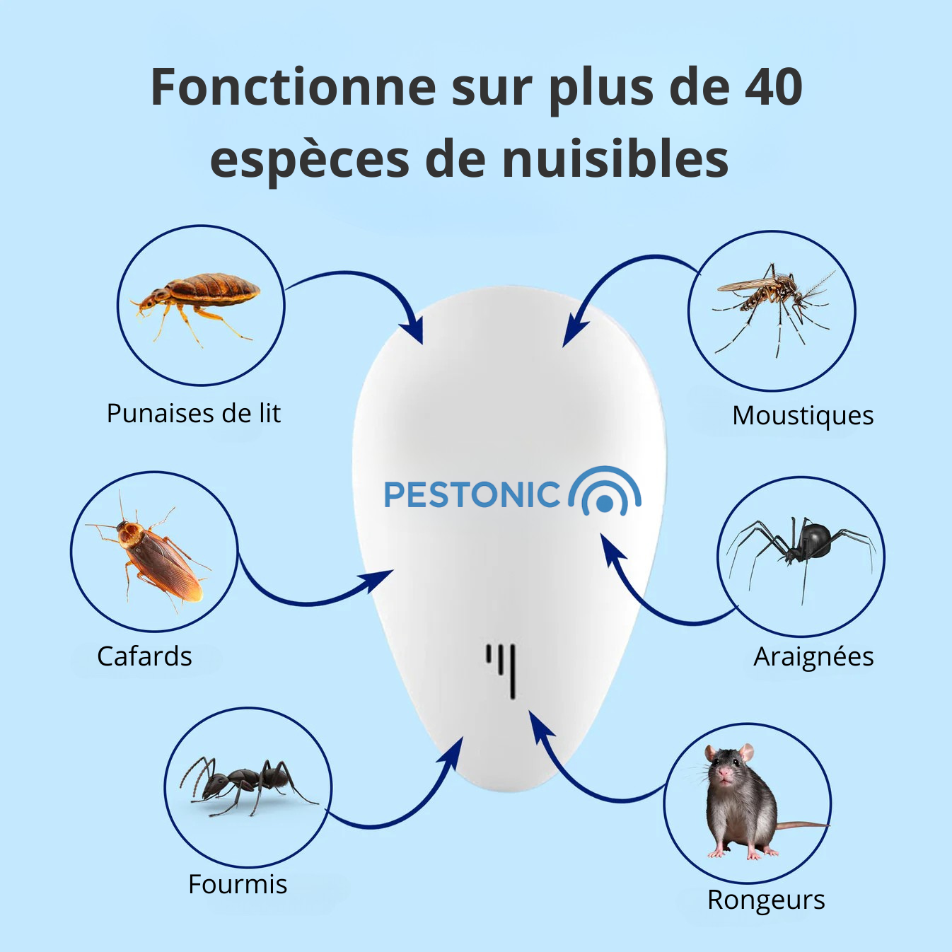 Pestonic utilise une technologie à ultrasons de fréquences variables ( 22-65 kHz) pour repousser efficacement moustiques, cafards, fourmis, araignées et rongeurs - sans produits chimiques ni odeur.