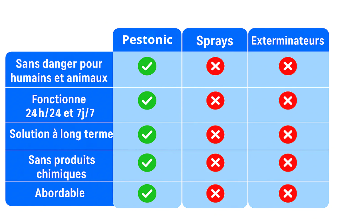 En moins d'une semaine, Pestonic repousse efficacement les nuisibles - sans produits chimiques, sans odeur et sans bruit.